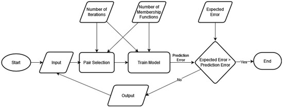 The pair selection module uses the sequential feature selection (SFS) procedure. The novel aspect of the method is identifying the best fit for each input variable using a two-input–one-output ANFIS model. A nested loop cycles through all potential pair combinations to achieve this. The two-input ANFIS model is then used with these as inputs. Then, the root means square error (RMSE) is calculated, recorded, and compared to the previous RMSE. Finding the lowest RMSE value at the end of the second loop will reveal the matched pair. The training phase can start after the pairings are chosen.