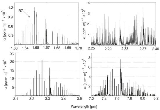 Quantitative gas spectra are available at the US National Institute of Standards and Technology, Pacific Northwest National Laboratory (PNNL) [7] and can be calculated from the HITRAN database [8]. The optical methods for methane detection use its absorption characteristics in the infrared range. Figure 1 shows the methane absorption spectra. The strongest bands occur in the area of deformation vibrations and then valence; they are weaker in the range of overtones.