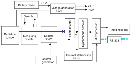 The radiation source is powered from a stabilized source that produces voltage. The operation of the device is guided by a microprocessor, which generates pulses that determine the rhythm of the system for controlling the control generator. The microprocessor produces a digital record of the amplitude of signals coming out of the synchronous detector block. The control generator ensures the generation of voltage necessary for electronic control of the spectral filter and ensures the rhythmicity of the synchronous detector block. An interference filter is mounted directly into the body of the photodetector in the range of 3.4 μm. The temperature of the detector is stabilized by a Peltier plate. The control signal of the thermal stabilization block comes from a thermoresistor mounted directly into the detector body.