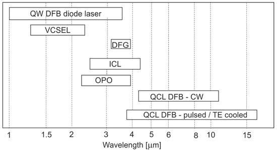 The ICL lasers, commercially available since 2009, have revolutionized the detection capabilities of hydrocarbons at the ppb and ppt levels. The range of emission lines for these lasers coincides with the absorption bands in the area of the valence vibrations (3–4 μm) of methane, ethane, ethylene, or acetylene. These sources are characterized by many advantages. They have a small size, can work in either pulse mode or continuous wave (CW) at room temperature and at a low power consumption [31,32,33,34,35]. The spectral ranges of radiation sources in the IR range are shown in Figure 6.