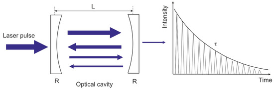 The principle of the CRDS method entails measuring the decay time of radiation trapped in an optical resonator. A pulsed laser beam with a duration of about 50 ns is introduced into a cavity consisting of two high-reflectance mirrors (R > 99.995%). After each reflection from the mirrors, a small portion (1 − R) of the circulating radiation is output while the remainder is reflected back into the cavity (Figure 10).