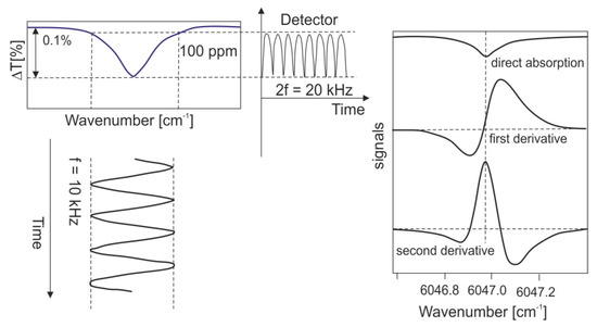 The WM/FM modulations can be combined with other laser absorption spectroscopy techniques such as CRDS and PAS. Sensors based on TDLAS technology are dependent on the availability of suitable laser sources, such as single diffuse feedback (DFB) laser diodes in the near-infrared range for ~3 μm [26], quantum cascade lasers (QCL) in the mid-infrared range (3.5–24 µm) [27], and interband cascade lasers (ICL) with a wavelength of 3–4 μm [28].