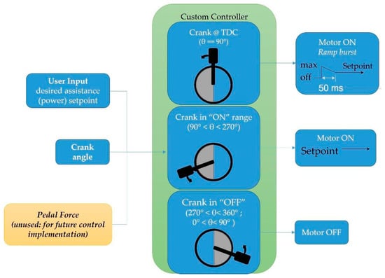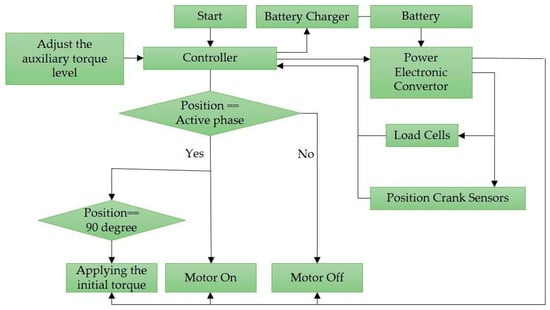 The logic flow of the motor control program is described in Figure 2. In this application, an Arduino Mega was used as the main controller performing two main tasks; (1) after pressing the start button and adjusting the assistive torque level, the controller turns on the motor and activates the electronic power converter through which the force sensor and crank position sensing system are initialized and communicate with the controller, and (2) the control method, shown in Figure 3, is executed to control the assistive torque. When the crank position sensing system identifies the crank in the downstroke phase (crank angle 90° to 270°), the controller turns on the BLDC motor. When the crank was at the TDC position (crank angle 90°), the motor power was set at its maximum to eliminate the time lag when increasing it to the set value, and then, the motor power decreased linearly to the set power in 50 ms based on a ramp function.