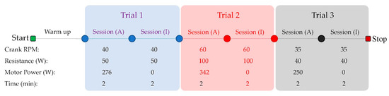 Experimental protocol at three different cadences and motor power assistance which occurred during Trials 1 to 3. Each trial consisted of two sessions of a pedaling task, where the APAD system was active in session (A) and inactive in session (I).