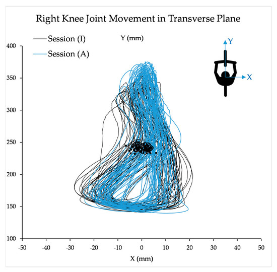 The lateral-medial movement of the target knee joint marker in the transverse plane was captured by the motion capture system, when APAD was inactive (I) and active (A). The square (■) and circle (○) markers represent the center point of the knee joint position during a full cycle for sessions (I) and (A) in Trial 1, respectively. The result is for a representative participant.