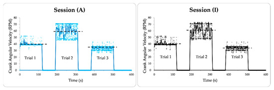 The distribution of real-time crank angular velocity (marker style “+”) and its average (solid line, window = 3 s) during sessions (A) and (I) through Trials 1 to 3. The target angular velocity is shown with the dashed line.