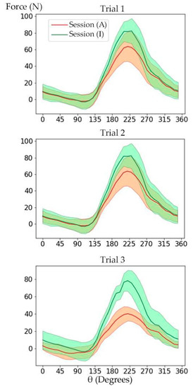 Figure 7 shows the amount of the crank perpendicular force measured by strain gauges during a full cycle of the crank for Trials 1 to 3. The overlap of force profile in sessions (A) and (I) was less in Trial 3, indicating that the APAD assistive pedal torque was more effective, which was also noted by the participants during the tests. The AUC of the force profile was computed to quantify the pedal force variation in response to APAD torque assistant. The mean and standard deviation of AUC and its corresponding p-value for the target leg is given in Table 2. The AUC was reduced by 19% to 40% in session (A) compared to the corresponding session (I), depending on the pedaling power. The p-value was less than 0.001 for all trials, which confirms that a significant reduction in pedaling force occurred when APAD was activated at different cadences and intensities.