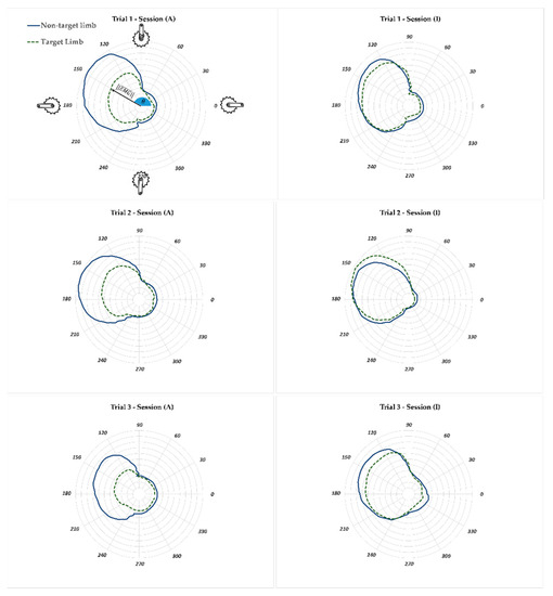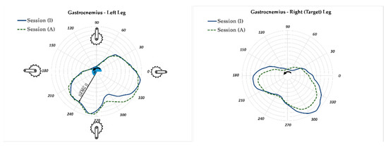 The AUC parameter is correlated to the performed work for a revolution of the crank. Thus less muscle activity is expected in session (A) compared to the corresponding session (I) for the target leg. However, the significance level of muscle activity reduction should be studied because there is a possibility that the activity of the muscle of interest was not affected. The gastrocnemius (GM) and vastus lateralis (VL) muscles are among the major contributors to force production in the pedaling task. Figure 8 and Figure 9 illustrate the polar plot of the GM and VL muscle activities. The radius and angle of the polar plot represent the magnitude of EMG and the crank angle, as defined previously, respectively. The GM and VL’s range of active angles can be easily interpreted from the polar plots. The GM muscles of the left and right legs had more than 50% of their respective maximum activity during the crank angle range of 180–360° (±30° SD) (Figure 8). This range for the VL muscle was 90–240° (±10° SD) (Figure 9). This means that the VL muscle had a more significant contribution in generating pedaling torque during the downstroke (crank angle 90° to 270°) compared to the GM muscle, which was also reported in previous studies [34,35]. The EMG profile of GM and VL muscles of the non-target limb did not change between sessions (A) and (I) as much as the corresponding muscles of the target leg. This could be an indication that the APAD system reduced the muscle load of the target leg, without affecting the muscle load of the non-target leg, which was the objective of developing APAD.