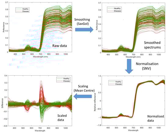 Pre-processing in this study included three steps: smoothing, normalisation, and scaling. Firstly, the raw data were smoothed using a Savitzky-Golay Filter (SavGol) [44] with the filter width w = 7. The high-frequency noise was smoothed from the raw data, especially for the wavelengths below 400 nm and above 900 nm, due to the sensitivity of the sensor being lower in these regions. Secondly, the smoothed spectral data were normalised with the standard normal variate (SNV) method [45]. The normalised data overcomes multiplicative and baseline effects caused by a difference in leaf angles, measurement distance and angles. Thirdly, the data were scaled using the mean centre method [46], which brought all wavelengths to the same magnitude and improved the models in the current study. Figure 2 demonstrates an example of pre-processing for 173 spectral data derived from Pinot Noir vines.