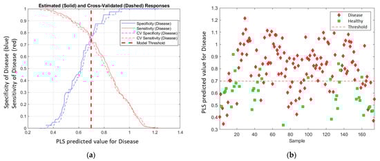 The PLS-DA model used LVs to calculate each data point (one spectral measurement) and project the result to a linear model—PLS predicted value (disease). The higher the value, the more likely the sample was to be in the predicted (disease) class. Then, a threshold was calculated to discriminate between the two classes. The threshold was based on a balance between sensitivity (Equation (2)) and specificity (Equation (3)) to minimise the error. The receiver operating characteristic (ROC) curve was used to determine the threshold, and the PLS-predicted value at the intersection of sensitivity and specificity was selected as the threshold (Figure 3a). Figure 3b visually illustrates the prediction for the Chardonnay model at the March 2021 timepoint. The samples that lie above the threshold were predicted as ‘Disease’ while samples below the threshold were predicted as ‘Healthy’.