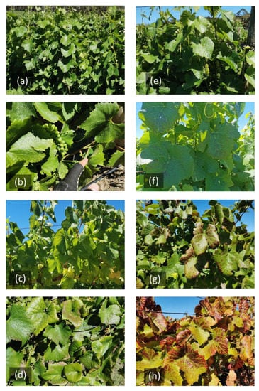 The GLD-infected vines at different development stages. Chardonnay in (a) November—flowering stage (EL-17); (b) December— pea-size berries; (c) February—veraison; (d) April—post-harvest. Pinot Noir in (e) November—flowering; (f) December—pea-size berries; (g) February—veraison; (h) April—post-harvest.