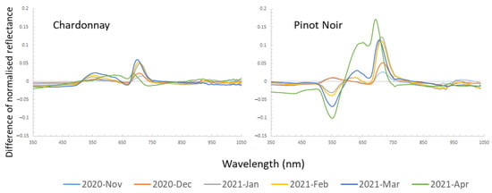 The difference between normalised average spectra of diseased and healthy vines was compared at each timepoint for the two cultivars as shown in Figure 5. An overall increase in reflectance difference over time in the diseased vines was observed in Chardonnay, which had the highest relative reflectance in March 2021. However, the difference decreased between the diseased and healthy vines in April. Between 690 to 730 nm in the red-edge region had a higher difference, and between 530 to 630 nm in the visible region showed a small increased reflectance in diseased Chardonnay. This matched the visual symptoms that diseased leaves were slightly yellower than healthy leaves, especially at later growth stages.