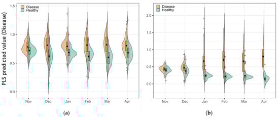 One advantage of the PLS-DA model is the explainable linear relationship between classes [34]. As the spectral signal changes over time, the evidence shows in the PLS predicted value in the combined violin and box plots (Figure 6). The vertical histograms show the sample distribution of both classes in the predicted value axis. Increased separation between healthy and disease classes can be observed over time in the plots. In the Chardonnay plot (Figure 6a), the samples in disease and healthy were close to each other in November and started to separate in December, and the largest separation was in March. In Pinot Noir, two classes overlapped in the first two timepoints; however, a noticeably higher PLS predicted value could be observed in disease samples from January, with the largest difference in April (Figure 6b). This plot matched the visual symptoms and the model results (Table 1 and Table 2) that provide a visual and subjective basis for the model performance.