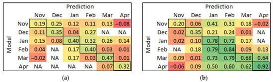 The matrix of MCC from each model prediction of other timepoints for (a) Chardonnay, and (b) Pinot Noir. The bold cells are the self-predicted results, which are equal to the calibration results. The colour score ranges from red (low value) to yellow (medium) to green (high value). NA means √((TP + FP)∙(TP + FN)∙(TN + FP)∙(TN + FN)) equal to zero that cannot be divided.