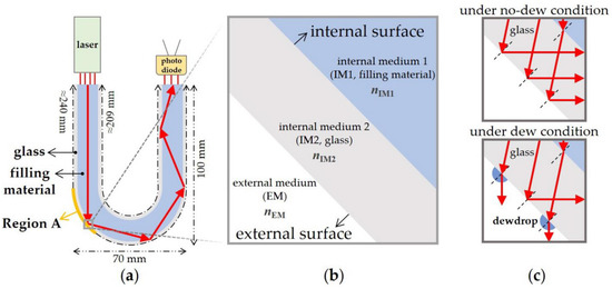 As shown in Figure 1a, the waveguide of the sensor was designed to have the external surface, i.e., Region A, where the first total reflection of the incident light occurs under conditions without dew by designing a proper curvature for the waveguide and by filling the waveguide with a material whose refractive index is larger than the external medium, i.e., ambient air (Figure 1a). Figure 1b shows the key denotations for this study. Under conditions with dew, the transmission of the light at Region A is induced by a local variation (i.e., a local increase) in the relative refractive index at Region A (Figure 1c), since the absolute refractive index of a dewdrop, i.e., water, is higher than that of air. Consequently, the measured photocurrent at the light-receiving part decreases, hence providing information on dew condensation.