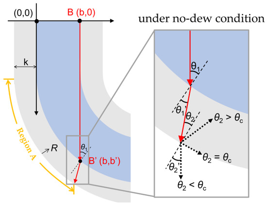 It was necessary to design a proper curvature for the waveguide in order to prevent a waste of incident light due to the transmission at Region A under conditions without dew. If the curvature is excessively large, plenty of incident rays are transmitted at Region A regardless of dew formation. In addition, an excessively small curvature for the waveguide is undesirable in terms of device miniaturization and light weighting. Accordingly, the curvature was designed to make the incident ray satisfy at without excessively reducing the curvature (Figure 2), where θ2 is the incident angle at the outer interface and θc the critical angle yielding total reflection under conditions without dew. Snell’s law for the external interface is written as , where is the absolute refractive index of the internal medium 2, is that of the external medium, and θ2’ the refraction angle. By inserting , the θc can be written as: