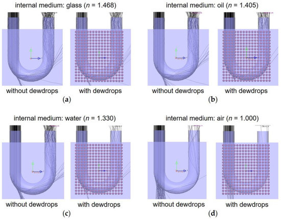 The optical simulation was performed to confirm a reduction in the amount of light received due to the formation of dewdrops followed by light transmission at the external interface. Water, oil, and glass, which are available at a low cost, were selected as internal media, i.e., filling materials for the waveguide. Figure 3a–d show the optical paths inside the simulated device, with and without dew, for various internal media, i.e., air (), water (), oil (), and glass (). Under the conditions with dew, as the absolute refractive index of the filling material decreased, the density of simulated rays at the light-receiving part decreased (Figure 3a–d).