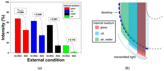 Figure 4a shows the specific intensity values at the light-receiving part, with and without dew, for the various filling materials. In contrast to the non-air (i.e., water, oil, and glass) samples, the air sample exhibited a relatively low intensity under conditions without dew. The relatively low intensity in the air sample without dew was attributed to the waste of incident rays due to the transmission at Region A. The intensity on/off ratio was defined as , where Inoff and Inon are the intensities without dew and with dew, respectively. The Inon/off values of the air, water, oil, and glass samples were 0.11, 0.261, 0.548, and 0.664, respectively. Although the air sample exhibited a smaller Inon/off than the non-air samples in the simulation, the application of air is unlikely to realize a sufficiently clear response to dew condensation because of the relatively low specific heat.