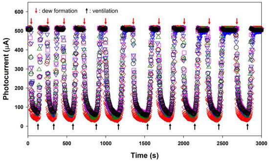 Figure 5 shows variations in the photocurrent through the photodiode over time. Actual dew-condensation sensors were fabricated using air, water, and glass as internal media for the waveguide. The responses of the sensors with various media to dew condensation were compared and evaluated. The sensor with the air-filled waveguide failed to detect dew condensation as no recognizable variation in the photocurrent occurred. A sufficient number of dewdrops were not formed on the surface of the air-filled waveguide, which was attributed to the relatively low specific heat of air. Moreover, the photocurrent of the air-filled waveguide without dew was excessively low, which possibly contributed to the poor response as well. By contrast, the sensor with the water-filled waveguide successfully detected dew condensation with a clear gap between the photocurrent levels, without dew and with dew. The maximum photocurrent on/off ratio was defined as , where PCoff is the average photocurrent under conditions without dew and PCon is the average minimum photocurrent under conditions with dew. The PCon/off values of the water and glass samples were 0.09 and 0.74, respectively. The PCon/off of the sensor with the water-filled waveguide was smaller than the other. The measured photocurrent at the light-receiving part decreased with dew formation; therefore, a smaller PCon/off indicated a clearer difference between the internal light intensities, with and without dew. Since the specific heat of water is larger than the glass, a higher amount of dew was produced on the surface of the water-filled waveguide than on that of the glass-filled waveguide. That is, the surface of the water-filled waveguide was more dew-friendly than that of the glass-filled waveguide; hence, resulting in the larger gap between the photocurrent levels both with and without dew. In addition, the sensor with the water-filled waveguide clearly exhibited a high accuracy of detection for the formation and evaporation of dew. As result of the specific heat of water being four times higher than the air, the surface temperature of the water-filled waveguide was able to be effectively maintained at a relatively low level despite the ambient temperature rise. That is, the humid air in the box, formed by evaporating water from the heater, was warmer than the water-filled waveguide surface, which in other words was colder than the humid air. After ventilating the area, the formed dewdrops began to evaporate, which increased the measured photocurrent to its initial level. This indicates that the evaporation of dewdrops was not excessively hindered by the physical adsorption of H2O molecules on the waveguide surface.
