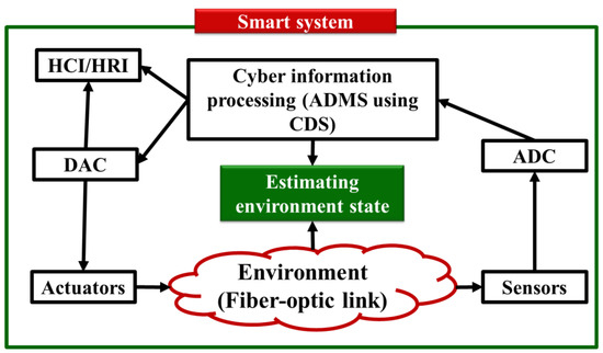 Intelligent system architecture using a cognitive dynamic system (CDS) as the cyber-physical system (CPS) and an autonomous decision-making system (ADMS). HCI: Human–computer interaction, HRI: Human–robot interaction, ADC: Analog-to-digital converter, DAC: Digital-to-analog converter.