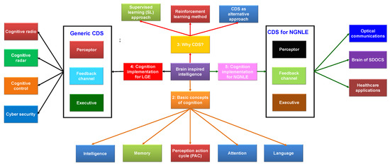 The paper covers various topics related to cognitive dynamic systems (CDS) and their applications, and a summary of the association among the sections/subsections is shown in Figure 2. In Section 1, an introduction and a summary of intelligent systems using CDS as an analogy for the brain is given. In Section 2, we introduce the basic cognition concepts, including the perception–action cycle (PAC), memory, attention, intelligence, and language. Next, in Section 3, we explain why CDS are necessary, discussing machine learning methods such as supervised learning and reinforcement learning. Next, we present the implementation of the principle of cognitions on linear and Gaussian environments (LGEs) using the conventional CDS structure in Section 4. This section also includes various applications, such as the cognitive radio, cognitive radar, cognitive control, and cyber security. In Section 5, we discuss the implementation of the principle of cognition on a non-Gaussian nonlinear environment (NGNLE) with finite memory, including applications in optical communications, software-defined optical communication system (SDOCS), and healthcare. Finally, in Section 6, we present an overall summary of the topics covered in the paper.