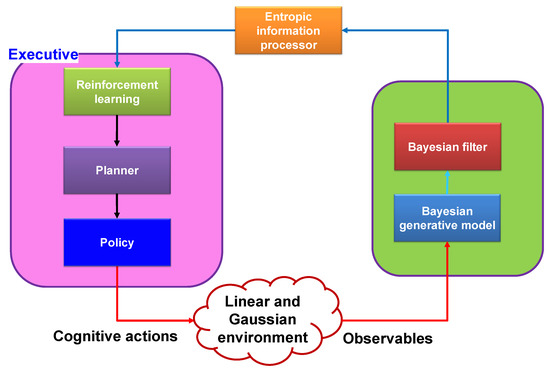 A conventional perceptor’s conceptual schematic typically consists of an entropic information processor, a Bayesian generative model, and a Bayesian filter (Kalman filter). For feature extraction in conventional CDS, the Bayesian generative model or Bayesian model is defined. When the observables are available, however, the Bayesian generative model is not necessary [16]. The Bayesian generative model is also an unwise choice due to its high computational cost. As a result, given the environment’s dynamic nature, it is impractical [17]. In the algorithmic implementation in [16,17], the Bayesian generative model was not used. The primary component of a traditional perceptor is typically a Bayesian filter. The state of the observables should be estimated by the Bayesian filter [9,16]. The perceptor frequently makes use of the typical Kalman filter, though, considering that a conventional CDS can only be used in settings with a linear model and Gaussian noise distribution [18]. The entropy of the Kalman filter output can be calculated with the aid of Shannon’s information theory [19,20]. However, the mean and covariance matrix for linear and Gaussian environments (LGE) are all that remain of Shannon’s equation for calculating entropy in typical CDS [16].