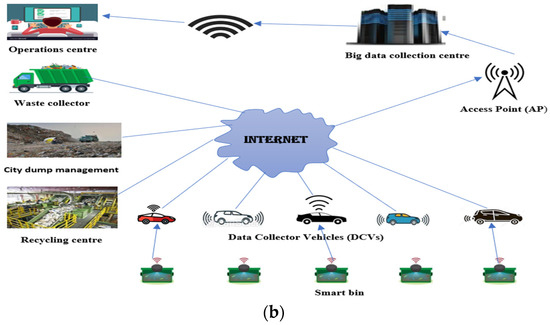 An IoV-based network model for smart city waste management. (a) An overview of Internet of Vehicles smart city waste management. (b) A model showing data collection for SC waste management.