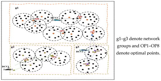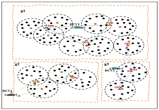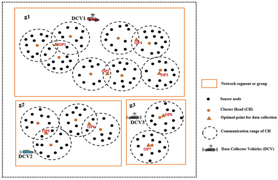 This section presents the network model of the proposed approach. Figure 4 shows the system model consisting of a large-scale wireless sensor network (LS-WSN) with a set of N stationary sensor nodes embedded in smart bins represented by a set () and mobile data collector vehicles (). The network model consists of segmented group of clusters that are spatially distributed across different unconnected regions. There are three network groups (g), and each group is unconnected to other groups. The network consists of a number of sensors, a set of cluster heads (CHs), and a set of optimal points (OPs) or data collection points (DCPs). CHs are leader nodes that collect data packets from other nodes and transmit them to the DCVs when they arrive at the DCPs. Data transmission to the DCVs occurs via a single-hop mechanism. The sensors in different groups or segments are clustered using the node partitioning algorithm presented in [11]. Each sensor is connected to the CH within its range of communication. Three major actors can be identified in the network, namely the static sensors (smart bins), the data collector vehicles (DCVs), and the base station (BS). The model makes the following assumptions: