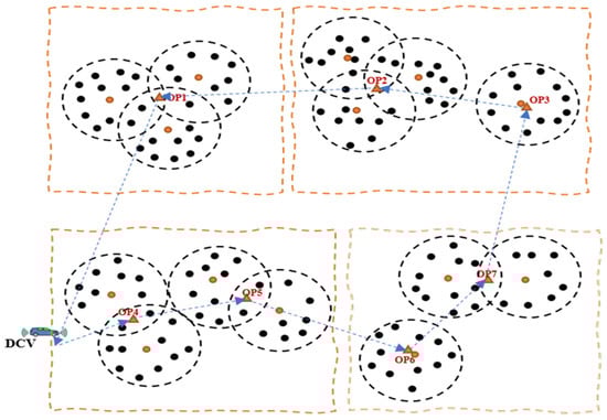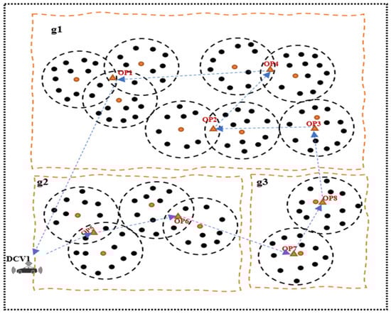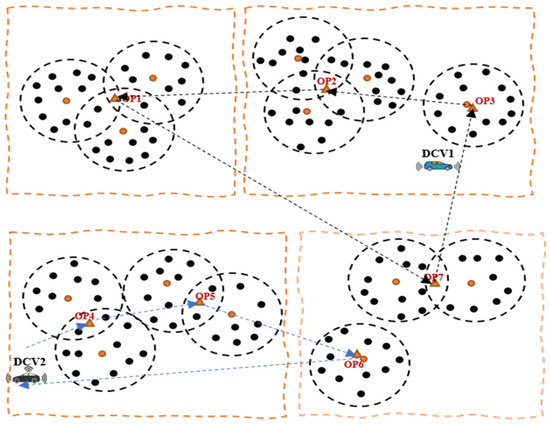 Let V denote the optimal number of data collector vehicles. To access the OPs in by the V data collector vehicles, the set is divided into V disjoint subsets. Thus, represents the partition of the entire set of Ops, where has n number of OPs (i.e., such that .