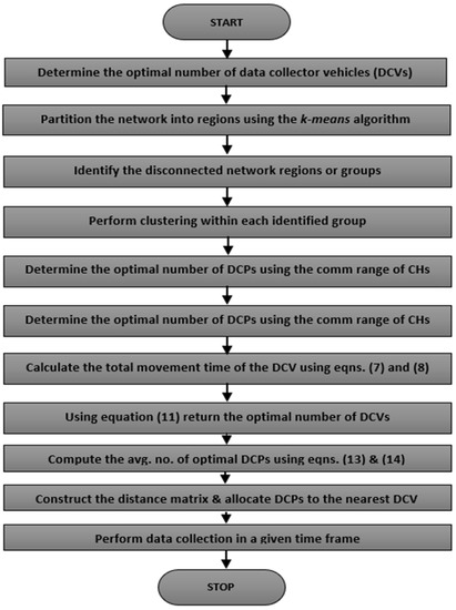 The proposed approach was used to investigate some of the critical tradeoffs affecting efficient big data collection and traffic engineering in LS-WSNs for SC waste management applications. The proposed scheme is an energy- and delay-efficient technique to identify the optimal number of DCVs and the optimal number of DCPs of DCVs. The purpose of this work is to leverage the advantages inherent in exploiting multiple opportunistic vehicles for data collection from multiple CHs simultaneously using a single-hop routing upon arrival at common overlapping regions of such clusters. Figure 7 shows the flow chart of the proposed model.