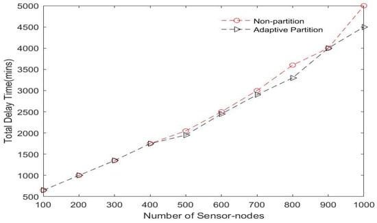 To effectively cover the widespread geographical regions of the network and optimize energy consumption for big data collection in an LS-WSN, we propose employing multiple DCVs. This provides advantages in terms of scalability, capability, flexibility, interoperability, and robustness. To solve the complex issue of scheduling multiple DCVs in LS-WSN scenarios, we propose an adaptive network partitioning strategy that partitions the entire network into multiple clusters and groups and assigns each group to a DCV. This partitioning scheme prevents DCVs from traveling long distances, thereby confining the scope of movements within the assigned regions. The use of a distributed clustering approach presents several advantages in real-world scenarios, as seen in [60], including energy consumption optimization, improving the route connection (i.e., minimizing delays), and increasing the scalability while reducing traffic. A brief description of the adaptive partitioning scheme is presented below. The network is adaptively partitioned into Ŕ regions, and the BS communicates this result to the DCVs. We adopted the improved k-means algorithm presented in [61] to perform network partitioning, which allows the DCVs to adaptively select a subset of sensor nodes with shorter distances from the centroid of each region. The objective is to minimize the traveling distance of the DCVs and optimize energy consumption. This is computed by taking the mean of (x, y) coordinates of all the nodes in the region. Nodes are assigned to the closest centroid of their region. Our adaptive network partitioning scheme adopted from [62] is compared to the traditional non-partitioning scheme for both small- and large-scale WSNs using some evaluation metrics such as energy consumption and delays. The results of this evaluation presented in Figure 8 and Figure 9 show that our adaptive network partitioning scheme is superior to the traditional method for LS-WSNs. However, the non-partitioning scheme appears to be effective for small-scale WSNs.