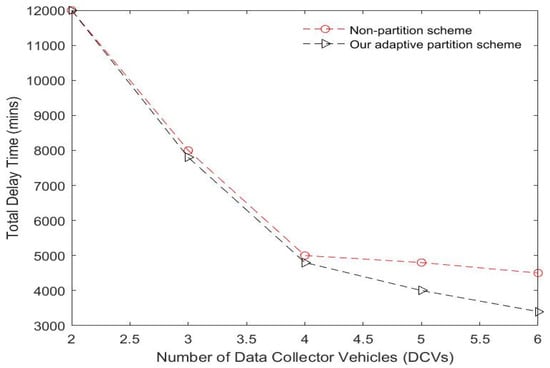 Comparing adaptive and non-adaptive partition schemes in terms of number of data collector vehicles (DCVs).