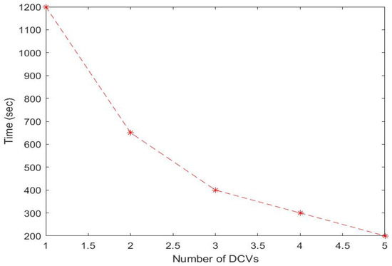 Let denote the deadline time constraint for data collection, and let V represent the optimal number of DCVs in deadline time constraint. Thus, the optimal time () using V number of DCVs is given by