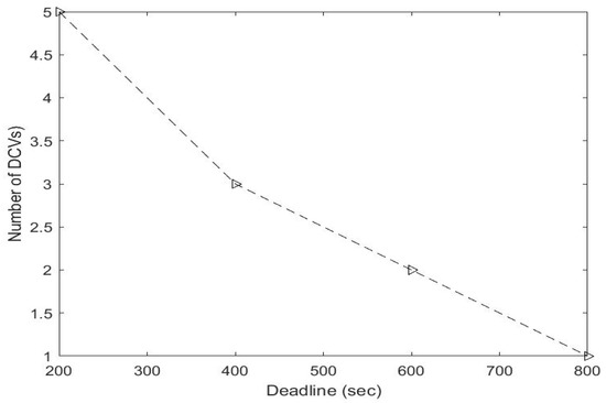 We set the deadline time to accomplish data collection to 400 s. Figure 12 shows the result of the maximum time usage with different numbers of MCVs. The figure shows that when (with more than 3 DCVs), the maximum time usage is less than 400 s. This implies that all DCVs would be able to complete their tasks before the deadline when the number of DCVs is greater than two. Thus, the optimal number of DCVs in this case is three. Figure 13 shows the result of the optimal number of DCVs at specific deadlines.