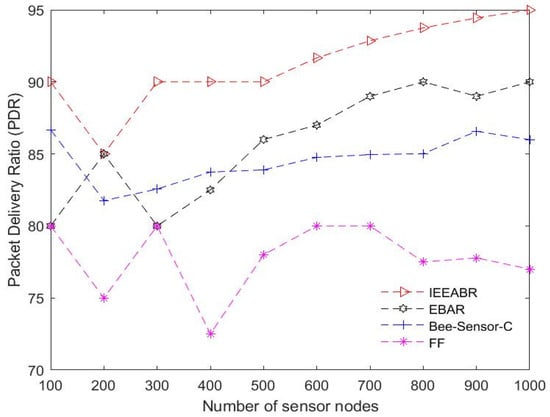 Figure 14 shows the performance of the different SI-based routing protocols in terms of the packet delivery ratio (PDR). PDR is referred to as the ratio of the total number of packets transmitted and received at the sink node or base station (BS). The total number of transmitted packets at the BS may be lower than or equal to those generated at the sensor nodes in the network. The results show that IEEABR outperformed the other SI-based protocols. The results show that initially, at a very minimal node density, IEEABR performed optimally by delivering approximately 90% of all the generated packets in the network at the BS via the DCVs, followed by Bee-Sensor-C, which achieved approximately 87% PDR, while EBAR and FF both achieved 80% PDR. As the node density gradually increased, IEEABR maintained optimal performance compared to the other protocols and achieved 95% PDR at a maximum node density of 1000. However, the performance of Bee-Sensor declined as the node density gradually increased and was outperformed by EBAR, which achieved 90% PDR at a maximum node density of 1000, followed by Bee-Sensor, with 86% PDR at a node density of 1000. The high performance of IEEABR is significant for critical large-scale sensor network applications running in smart cities, which require high data delivery performance. This implies that waste management operations employing IEEABR strategies can achieve high delivery performance to meet the requirements of the smart city ecosystem.