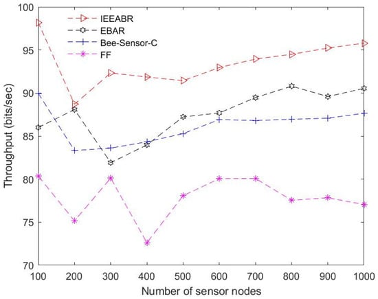 Figure 15 shows the performance of the SI-based protocols in terms of throughput. Throughput refers to the overall number of packets that are successfully delivered at the sink node or BS within one second. In general, IEEABR outperformed the other routing protocols, followed by EBAR, Bee-Sensor-C, and FF. An important observation in Figure 14 is the performance decline in throughput values with increasing node density. Ordinarily, throughput is improved by increasing the number of sensor nodes in the network. However, increasing the node density in the network should be synchronous with the number of DCVs sent into the network. However, due to the issue of network complexity and cost, increasing the number of DCVs as the node density increases is counterproductive, requiring an optimal number of DCVs to maintain network stability. Hence, the decline in throughput values exhibited by IEEABR, Bee-Sensor-C, and FF with increasing node density is normal.