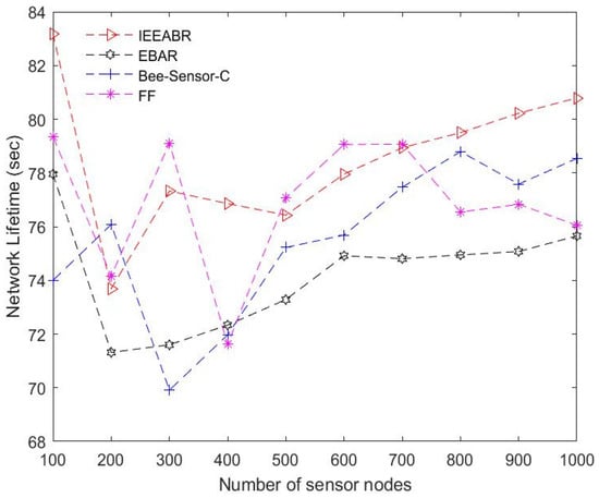 Figure 16 shows the network operational lifetime prediction of the routing protocols. The network lifetime is the extended lifetime of the network for various rounds in a given time. As can be observed, IEEABR outperformed the other protocols, with the longest lifetime. All the routing protocols achieved good network lifetime, with IEEABR achieving the longest network lifetime, followed by Bee-Sensor, EBAR, and FF. This evaluation is very significant, as it shows the efficacy of SI-based techniques in saving energy and prolonging the network lifetime. This makes such techniques suitable for SC applications such as waste management and target-tracking applications. Applications employing SI-based techniques for data collection are able to minimize energy consumption at the sensor nodes since data collection within short ranges is enabled, and protocol overheads are transferred to the DCVs, thereby saving energy at the sensor nodes, optimizing their energy consumption and increasing the network lifetime.