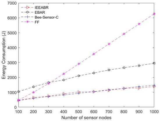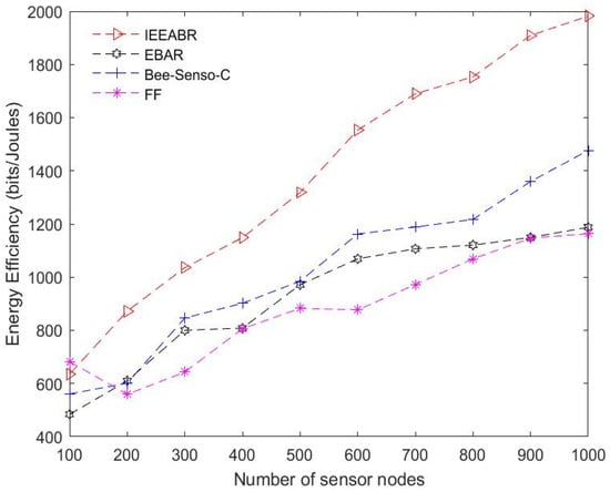 Figure 17 and Figure 18 show the performance in terms of the average energy consumption and energy efficiency, respectively. The energy consumption of the sensor nodes refers to the total energy expended by all sensor nodes in the network in transmitting their data to the DCVs. In this case, IEEABR outperformed the other protocols for these metrics by achieving a low energy consumption, even at a maximum node density, and achieving the highest energy efficiency, followed by Bee-Sensor-C, EBAR, and FF. This suggests that applications employing IEEABR techniques minimize their energy consumption values and optimize energy efficiency. Optimizing energy consumption for big data collection in LS-WSNs is one of the critical targets of this study, which proposes an SI IoV-based technique for data collection for SC waste management applications. It can be seen that this objective can be clearly achieved by employing SI-based techniques exploiting IEEABR strategies.