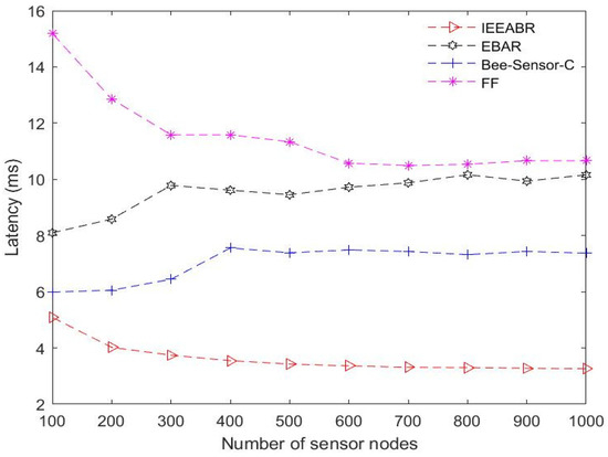 Figure 19 shows the performance in terms of latency. The latency in this context refers to the time required for a DCV to traverse the OPs/DCPs for data gathering and transferal of the collected data to the BS. However, the time spent by the CHs on data gathering within their clusters is negligible. This is because data transmission speed within clusters is faster than that between CHs and DCVs, so the data gathering latency is mostly affected by the trajectory length. Hence, in determining the latency, there is a need to consider the total number of location points or DCPs. As shown in Figure 19, IEEABR outperformed the other protocols on this metric by achieving the lowest latency compared to the other models, even at a maximal node density, followed by Bee-Sensor-C, EBAR, and FF. The reason for the high latency of FF with a potential high energy consumption may be its redundant message retransmissions of data and frequent message collisions in a dense network, as well as flooding of the network, resulting in network congestion. However, waste management scenarios may not involve latency as a major issue since the vehicles are exploited opportunistically for data collection within some degree of delay tolerance.