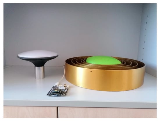 In this work, the low-cost simple RTK2B V1 GNSS board (~200 EUR) was used, which contains the dual-frequency ZED-F9P GNSS chip from u-blox [8,9]. The ZED-F9P can receive satellite signals in both frequencies (F1 (1575.42 MHz) and F2 (1227.60 MHz)) from all available satellite constellations [8]. In F1 frequency those devices can track L1 C/A, L1OF, E1, and B1l signals while in F2 frequency, L2C, L2OF, E5b, and B2l signals. The simple RTK2B V1 board was used in combination with the Survey calibrated low-cost antenna offered by Ardusimple (denoted as LC−1 below), which has a phase center error of 1 mm and known calibration parameters from NGS (Figure 1) [9]. Another simpleRTK2B V1 board was used in combination with a geodetic antenna (JAV_RINGANT_G3T) from the Javad manufacturer (San Jose, CA, USA) denoted as LC−2 below). We used a high-quality GNSS geodetic instrument as a reference, Leica GS18T receiver and LEISGS 18 antenna, denoted as GD−1 below (Wetzlar, Germany). The geodetic GNSS instrument was used for the comparison of GNSS data, as well as to determine the coordinates of all points (described below) that were used as reference values.