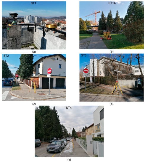 The study area was selected near the building of the Faculty of Civil and Geodetic Engineering of the University of Ljubljana (UL FGG), which offers both open-sky and urban conditions for conducting the observations. Five measuring stations were selected with positions shown in Figure 2. Station 1 (ST 1) is located on the rooftop of UL FGG and has open-sky conditions, while station 1A (ST 1A) is surrounded by trees (10 m) and buildings (Figure 3). GNSS observations from these two stations are used to verify the observation quality in open-sky and urban areas.