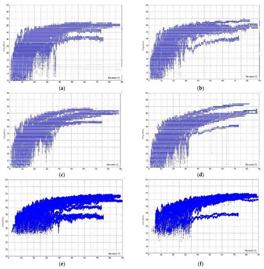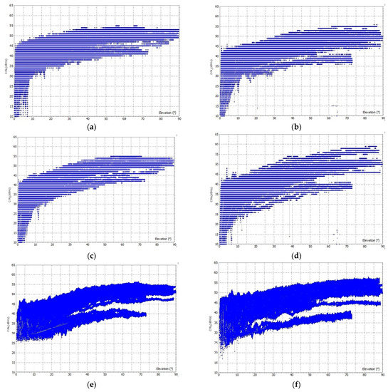 C/N0 for observations in F1 and F2 frequency in the urban areas: (a) F1 C/N0 for LC−1, (b) F2 C/N0 for LC−1, (c) F1 C/N0 for LC−2, (d) F2 C/N0 for LC−2, (e) F1 C/N0 for GD−1, and (f) F2 C/N0 for GD−1.