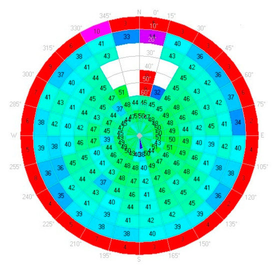 The LC−1 was additionally analyzed for its C/N0 in the open sky for 24 h using the open-source application u-center [31]. From the results shown in Figure 5, the C/N0 at elevation angles below 10° is less than 10 dBHz, while the C/N0 at elevation angles above 10° is more than 30 dBHz. The overall average C/N0 is 43.5 dB Hz with a deviation unit of 0.9 dBHz.