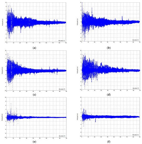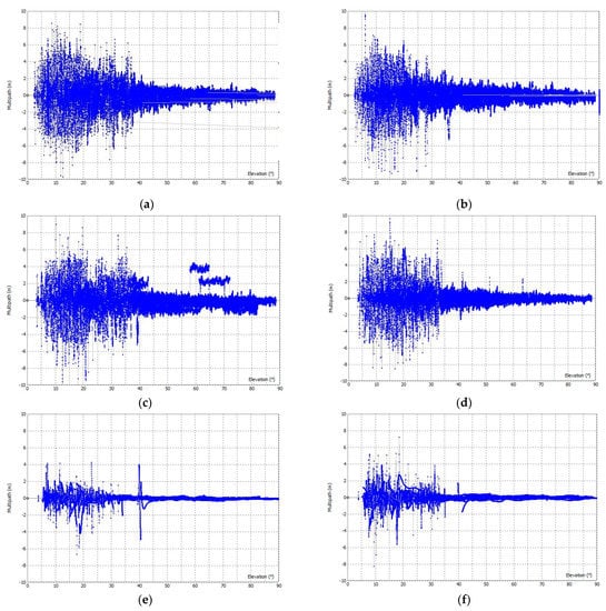 Multipath for code observations in F1 and F2 frequency in urban areas: (a) F1 multipath for LC−1, (b) F2 multipath for LC−1, (c) F1 multipath for LC−2, (d) F2 multipath for LC−2, (e) F1 multipath for GD−1, and (f) F2 multipath for GD−1.