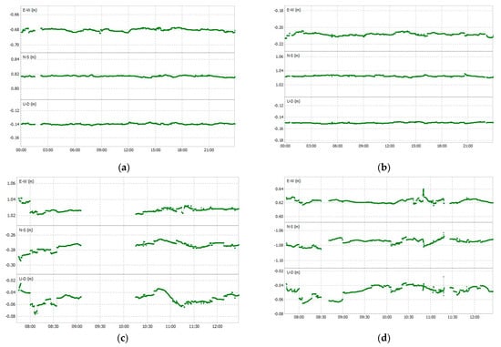 The ambiguity resolution ratio results are shown in Table 3 for LC−1 and LC−2. In the open sky, with less multipath and higher values of C/N0, the ambiguity fix ratio is more than 95%, LC−2 achieves an ambiguity fix ratio of 98.3%, while for LC−1 it is 96.8%. The difference is more obvious in urban areas, where the LC−2 has an ambiguity fix ratio of 93.4%, while it is only 75.0% for LC−1. Using a geodetic antenna improves the ambiguity fix ratio and provides fix solutions most of the time. In the case of the low-cost antenna, for intervals longer than 1 h, only float solutions are obtained. This may indicate the inappropriateness of using low-cost devices in similar conditions. The obtained positioning solutions for easting, northing, and ellipsoid height are shown for LC−1 and LC−2 in Figure 9 for both open-sky as well as urban conditions. In the open sky, fix solutions are obtained most of the time, while in urban areas more float solutions are present, which are shown with gaps in Figure 9.
