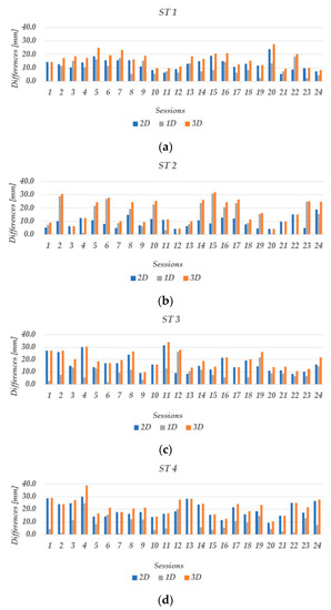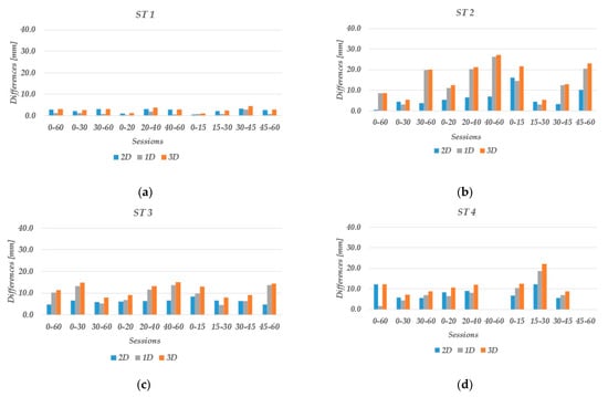 Low-cost dual-frequency GNSS receivers were tested in RTK in both open-sky and urban areas. Firstly, the RMSE for easting, northing, and ellipsoid height was estimated, then the horizontal and spatial RMSE were obtained for all stations by considering 24 sessions (Table 8). From the obtained results, it can be concluded that the horizontal and spatial RMSE in the open sky (ST 1) is less than 1 cm. Similar results were obtained for other stations (ST 2, ST 3, and ST 4) in urban areas, where the horizontal and spatial RMSE does not exceed 2 cm. To evaluate the quality of positioning of low-cost GNSS receivers in RTK mode, the positioning accuracy was estimated as the absolute difference in horizontal (d2D), vertical (ƛh), and spatial absolute (d3D) positions from the true position (Figure 11).