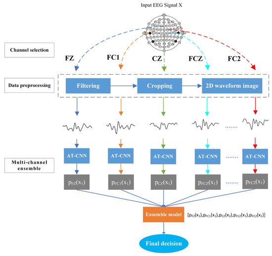 In this paper, we proposed a multi-channel ensemble method for ErrP detection using 2D EEG images. Figure 2 illustrates the overall architecture of our model. First, we selected several channels from the anterior cingulate cortex (ACC) containing ErrP signatures. Then, the 1D EEG signal of the selected channel was preprocessed and converted to 2D EEG image, and input into the AT-CNN model, respectively. Each AT-CNN was classified to provide local decision information for that channel. A channel ensemble classifier was used to integrate the local decisions of each channel to make the final decision. Since the signal characteristics of each channel are different, each AT-CNN model needs the EEG data of the corresponding channel for training. After the training, each model plays the role of an expert.