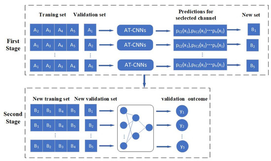 The training process of AT-CNN of each channel and ensemble classifier is divided into two stages as shown in Figure 5. In the first stage, we divide the dataset into five subsets of the same size, ,where is referred to as all data of the subset and is the label of the corresponding subset. In the first round, the union of is used as the training set and is used as the validation set. Given the input , AT-CNNs in this stage make corresponding predictions ,…, where is a binary variable and refers to the prediction result of the channel n. After the classifications in the first round, we assemble the predictions of each AT-CNN model into ,…, which is merged with the corresponding label y1 to form a new dataset , for use in the second stage.