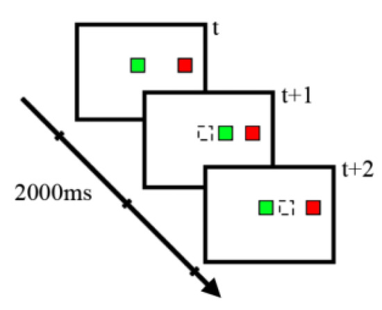 Experimental paradigm. Two squares are displayed on the horizontal line in the center of the screen; one is the cursor (green square), the other is the target (red square), and the dotted square is the previous position of the cursor. The interval time of cursor movement is 2 s, and the cursor moves away from the target with the probability of 20%.