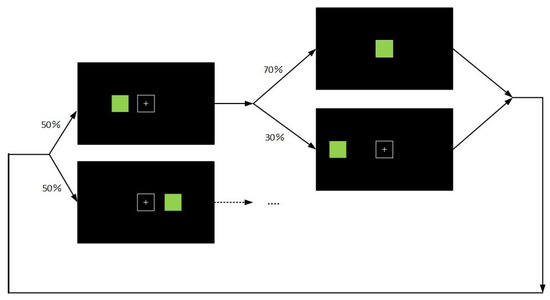 Experimental paradigm of dataset 2. A green square and a white box are displayed on the horizontal line in the center of the screen. With the same probability, the green square appears either on the left side or on the right side of the white box. After a 4 s interval, the green square moves, and there is a probability of 70% that the green square will move to the white box, and a probability of 30% that it will move away from the white box.